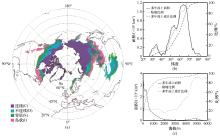 (a); variations of the permafrost area (solid line) and its fraction (short dashed line) of the land surface at each latitude, and the accumulated fraction with latitudes (long dashed line) in the Northern Hemisphere