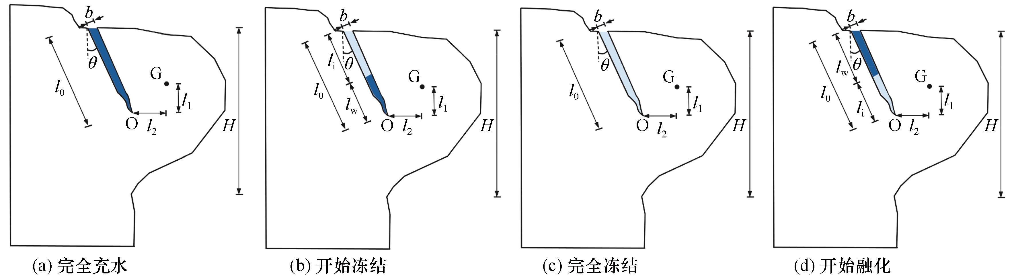 Dangerous rock models with water at different stages of main control structural plane: (a) completely filled with water; (b) beginning to freeze; (c) completely filled with ice; (d) beginning to melt