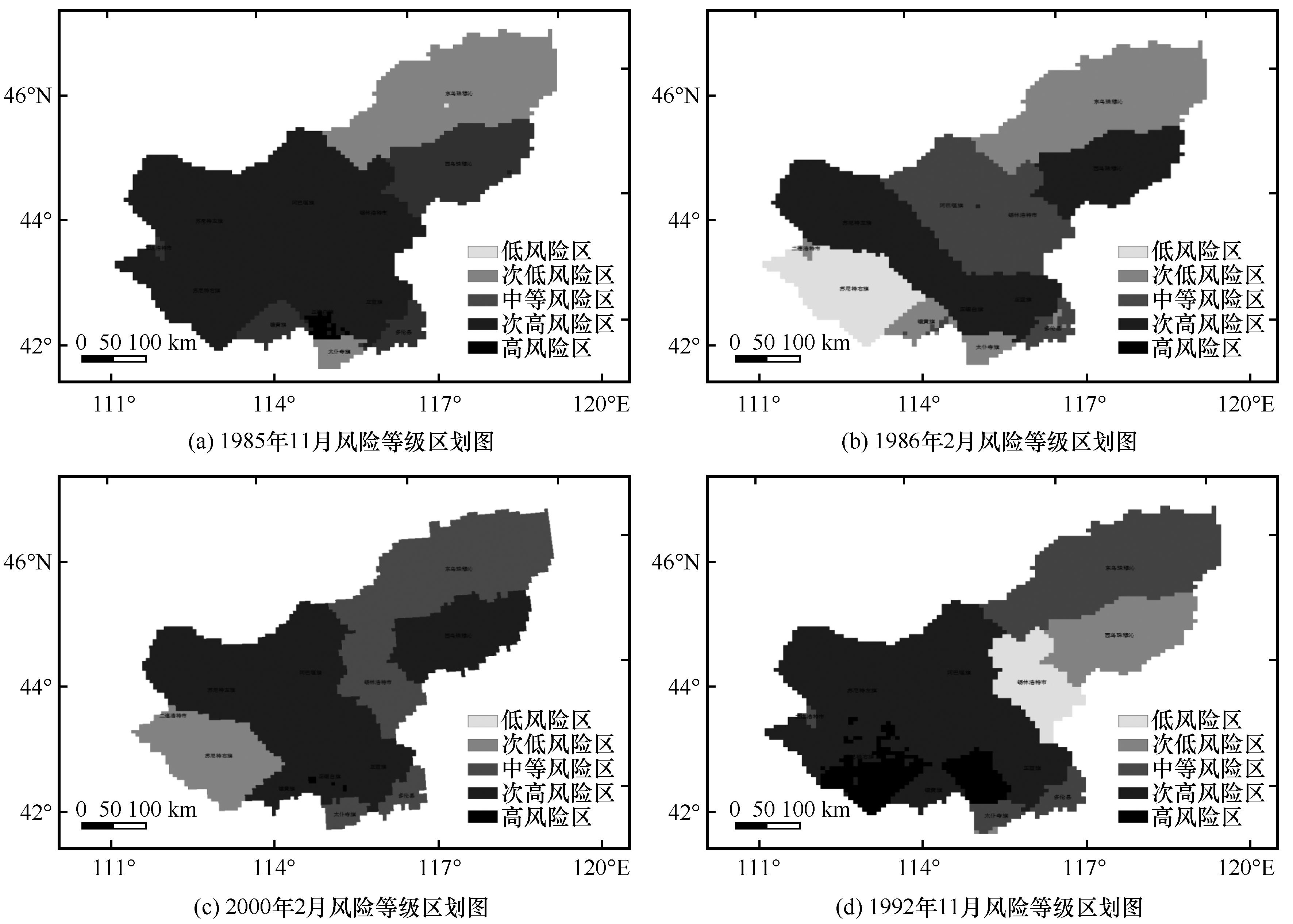 Maps showing the snow disaster risk classification in Xilingol League in Nov. 1985 (a), Feb. 1986 (b), Feb. 2000 (c) and Nov. 1992 (d)
