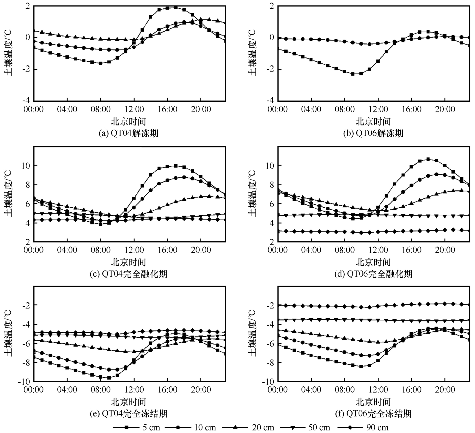 | Fig.3 Variations of hourly averaged ground temperatures at QT04 (a, c, e) and QT06 (b, d, f) sites at different depths in the unstable thawing (a, b), stable thawing (c, d), stable freezing (e, f) stages |