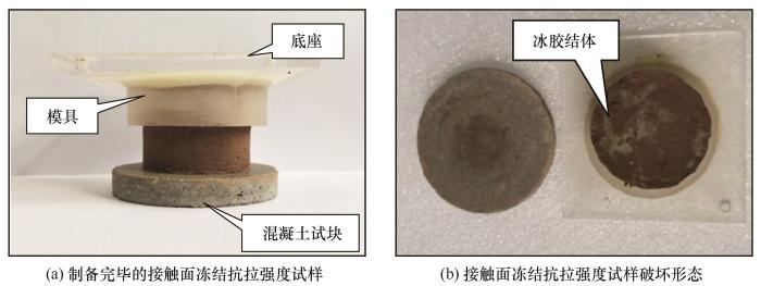 试样制备过程参考《铁路工程土工试验规程 TB 10102-2010》, 采用击实法进行。首先, 在预制水泥砂浆试块上放置土样模具, 向模具内填充预先配置的指定含水率的粉土, 并保证其位于水泥砂浆试块中心。随后, 采用干密度控制法对土样分三层击实, 形成粉土-混凝土接触面。最后, 拆除下半部模具, 并在土样上端采用环氧树脂胶固定底座, 使其与土样及模具胶结, 则粉土-混凝土试样制备完成。制样完成后, 将试样整体经保鲜膜包裹处理后静置12 h, 为环氧树脂胶提供足够硬化时间。最后将包裹试样置于高低温交变试验箱中以试验设定温度冻结48 h, 使粉土-混凝土接触面形成冻结抗拉强度。制备完成的试样如图3 (a)所示, 试样破坏形态如图3 (b)所示。由图3 (b)可见, 试样在粉土-混凝土接触面处首先断开, 接触面处土样具有肉眼可见的冰胶结体。