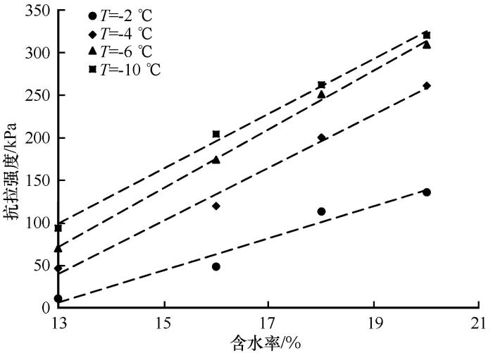 对比不同温度下接触面冻结抗拉强度随含水率变化规律可以发现, 随着温度降低, 含水率增加对抗拉强度的促进作用得到加强。