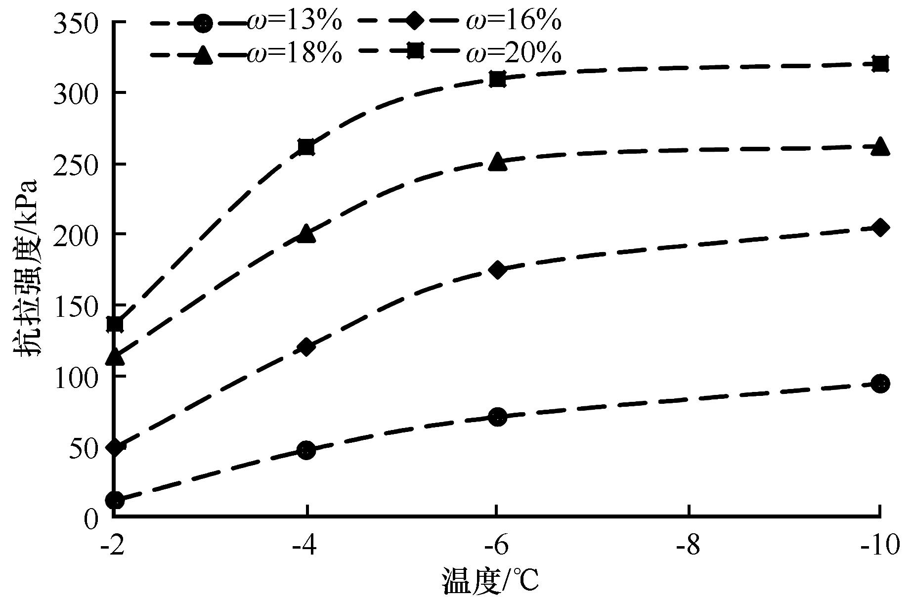 | 图7 不同含水率下接触面冻结抗拉强度随温度变化情况 |
