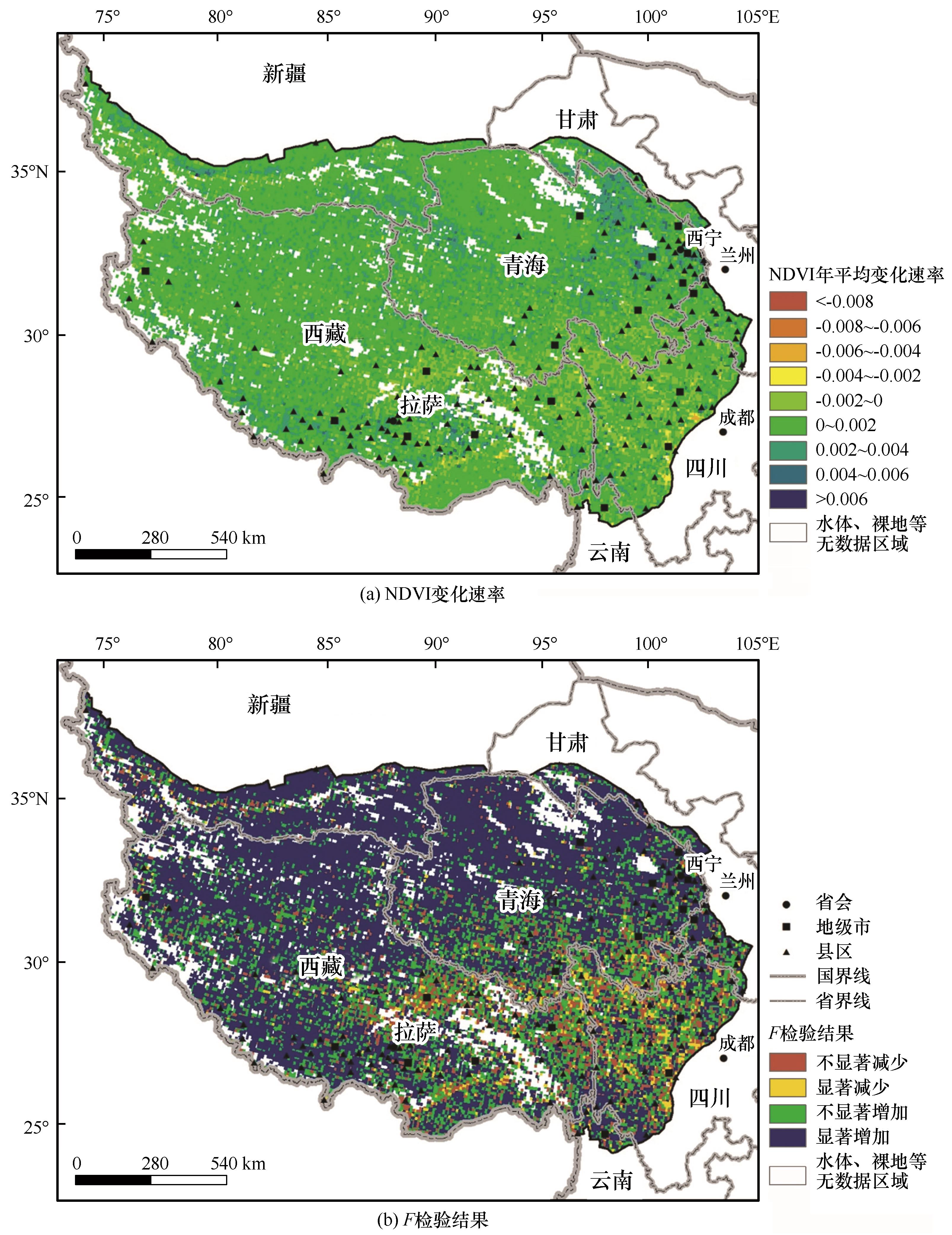 | 图3 NDVI变化速率(a)和F检验结果(b)空间分布 |