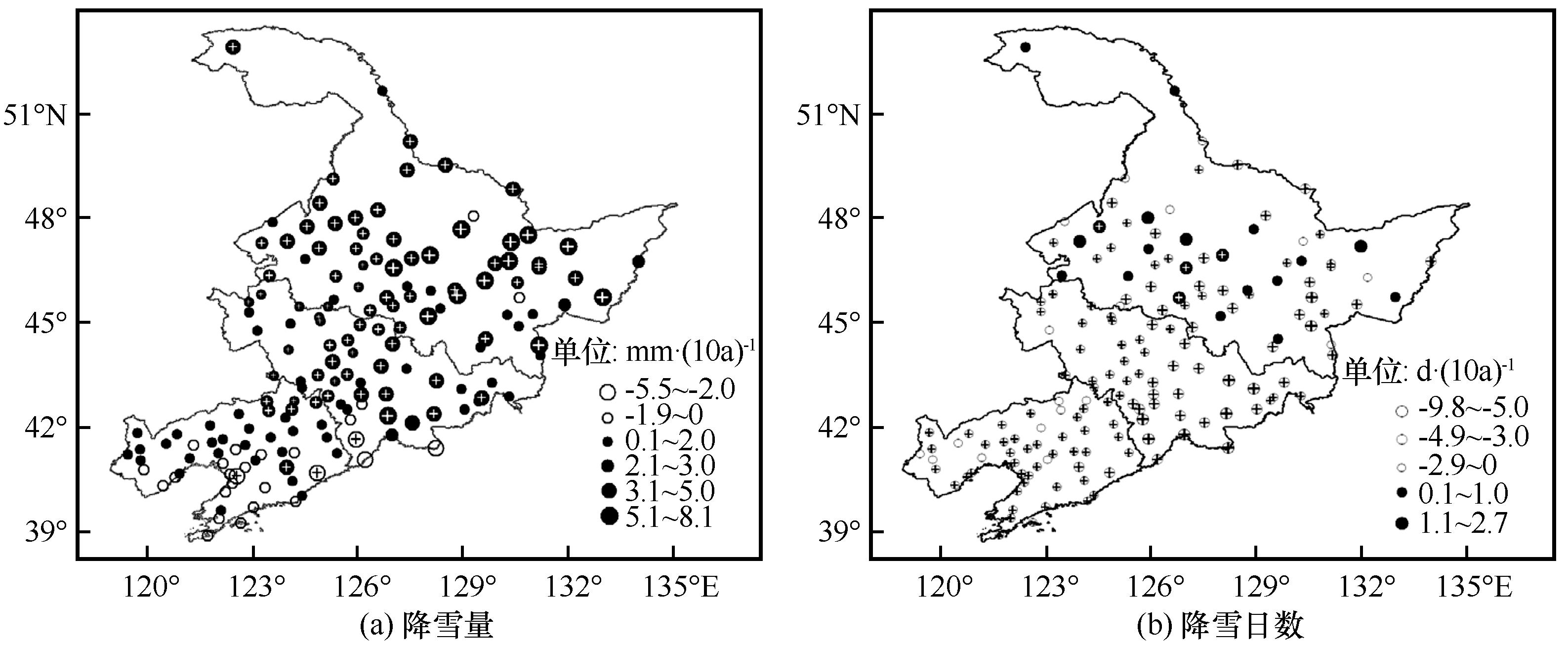 | Fig.7 The spatial distributions of linear trend of annual snowfall (a) and of snowfall days (b) from 1961 to 2017 in Northeast China (+ denotes the trend significant at the 95% confidence level) |