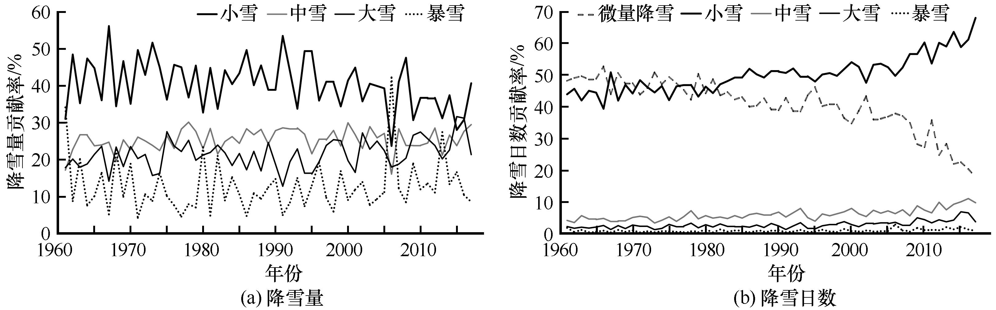 | 图9 1961 - 2017年东北地区各等级降雪量(a)、 降雪日数(b)贡献率 |