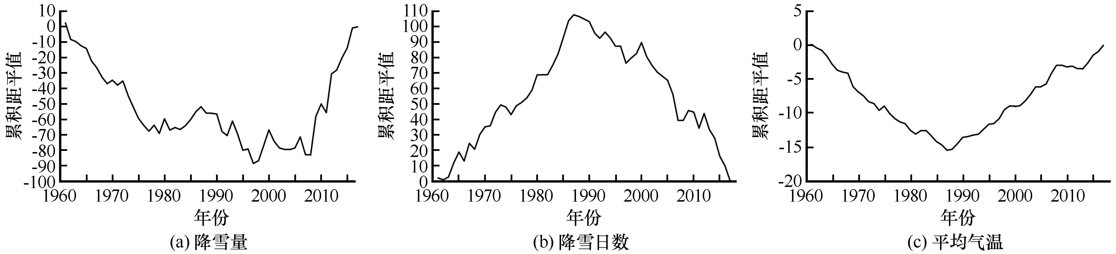 | 图10 1961 - 2017年东北地区年降雪量(a)、 降雪日数(b)及平均气温(c)累积距平曲线 |