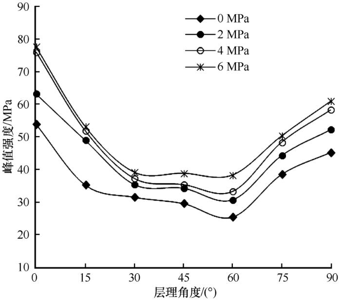 不同围压下峰值强度随层理角度的变化(冻融循环次数n=0)