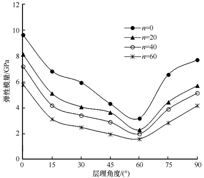 不同冻融循环次数下弹性模量随层理角度的变化(σ3=0 MPa)