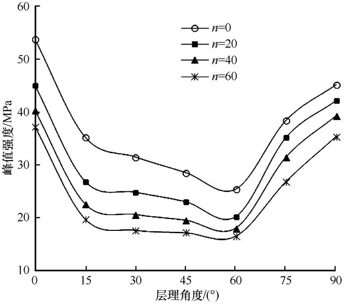 不同冻融循环次数下峰值强度随层理角度的变化(σ3=0 MPa)