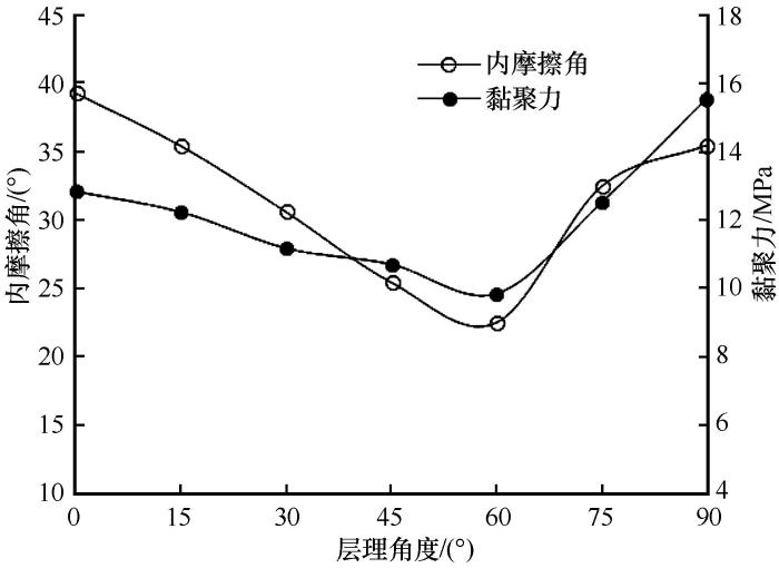 (1) 砂岩岩样的弹性模量、 峰值强度、 黏聚力和内摩擦角均随着层理角度的变化呈现先减小后增大的U型发展趋势。在层理角度为60°附近时, 其值最小, 最大值出现在层理角度为0°或90°附近, 此变化规律与岩样的破坏模式关系密切。层理角度为60°时岩样发生沿层理面的剪切滑动破坏, 其值较低; 而在层理角度为0°或90°, 破坏模式为穿越基质和层理面的劈裂破坏, 其值较高。