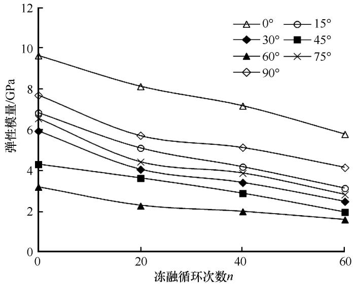 Variations of elastic modulus with number of freeze-thaw cycles under different orientation angles (σ3=0 MPa)
