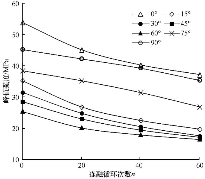 Variations of peak strength with number of freeze-thaw cycles under different orientation angles (σ3=0 MPa)