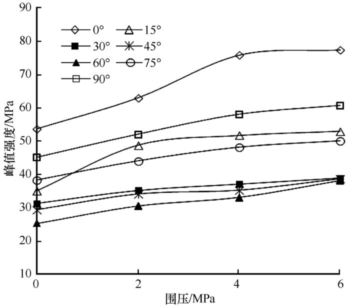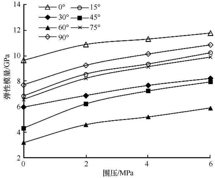 (3) 随着围压的增大, 对于相同层理角度的砂岩, 其弹性模量和峰值强度呈现增加的态势。围压较小时, 曲线较陡, 增加的幅度较大; 围压较大时, 曲线趋于平缓, 增加的幅度较小。这说明围压对岩石材料的各向异性具有明显的退化效应。