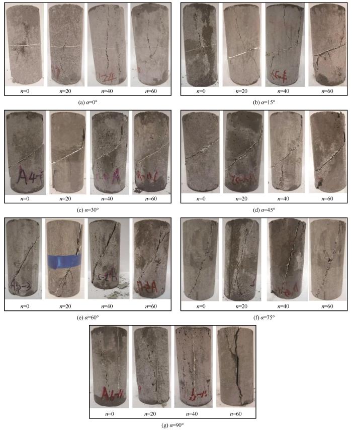 在冻融循环作用下, 岩样的破坏面由单一破坏面逐渐转化为多个破坏面, 破坏模式也从单一的剪切破坏转变为复合拉剪破坏, 且主裂纹在破坏过程中有晶体崩落现象。其主要原因是反复的冻融作用使岩石孔隙增加, 使得破裂面变得越来越复杂。随着冻融循环次数的增加, 岩样表面有冻酥的迹象, 裂缝宽度也比少次冻融循环时的值小, 且主控破裂面的破坏迹线随着冻融循环次数的增加而增长。