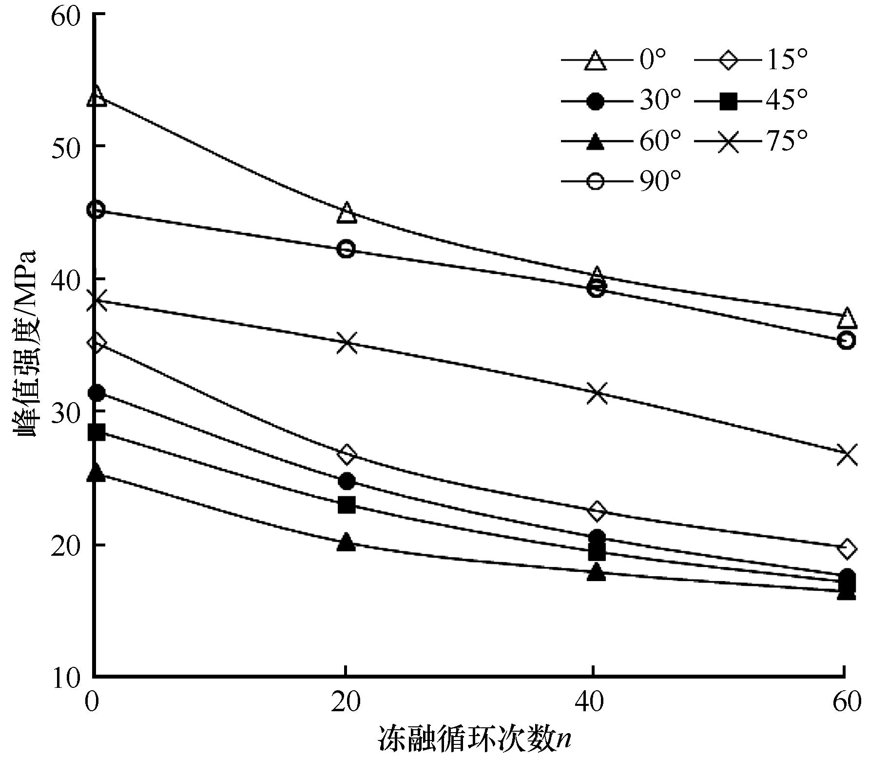 | Fig.7 Variations of peak strength with number of freeze-thaw cycles under different orientation angles (σ3=0 MPa) |
