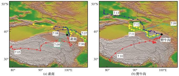 ... 通过肃南夏季PSCF分析图[图10(a)]可以看出, 河西地区东部和西南部、 青海省西北部、 新疆东部均是PSCF分析的高值区, 部分研究[33-35]表明这些区域夏季高温干燥, 蒸发量大.值得注意的是青藏高原东南部也是一个高值区, 这是因为高原东南部作为一个“高湿区”[36], 在夏季蒸发旺盛, 高值概率在30%以上, 也是研究区的潜在蒸发源地, 这与已有研究结果相似[20].图10(b)显示, 民乐夏季PSCF值的高值区集中在研究点附近及河西地区东部, 高值概率在40%以上.图10(c)显示, 祁连夏季PSCF值的高值区集中在研究点周围的祁连山区、 河西地区东部及西南部、 青藏高原东南部, 已有研究表明[37-38], 上游的祁连山区在夏季蒸发强烈.图10(d)显示, 托勒夏季PSCF值的高值区集中在祁连山区、 新疆东部、 河西地区东部及西南部, 高值概率在40%以上. ...