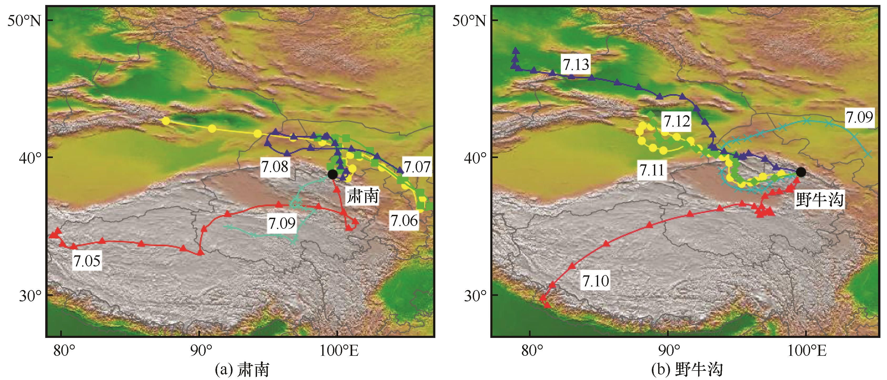| 图13 肃南(a)和野牛沟(b)持续性降水后向轨迹分析 |