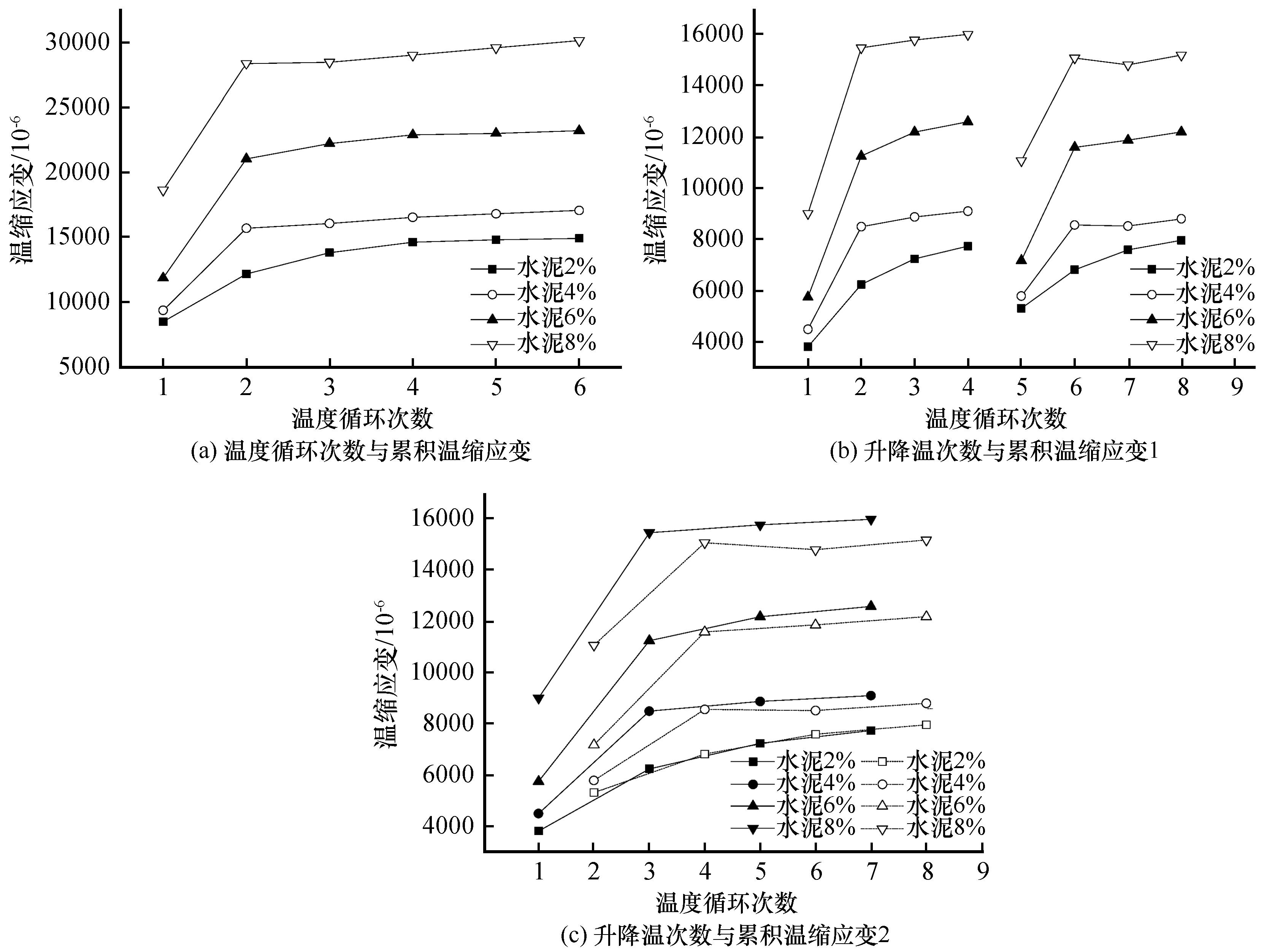 | 图8 水泥改良土累积温缩应变随温度循环次数的变化 |
