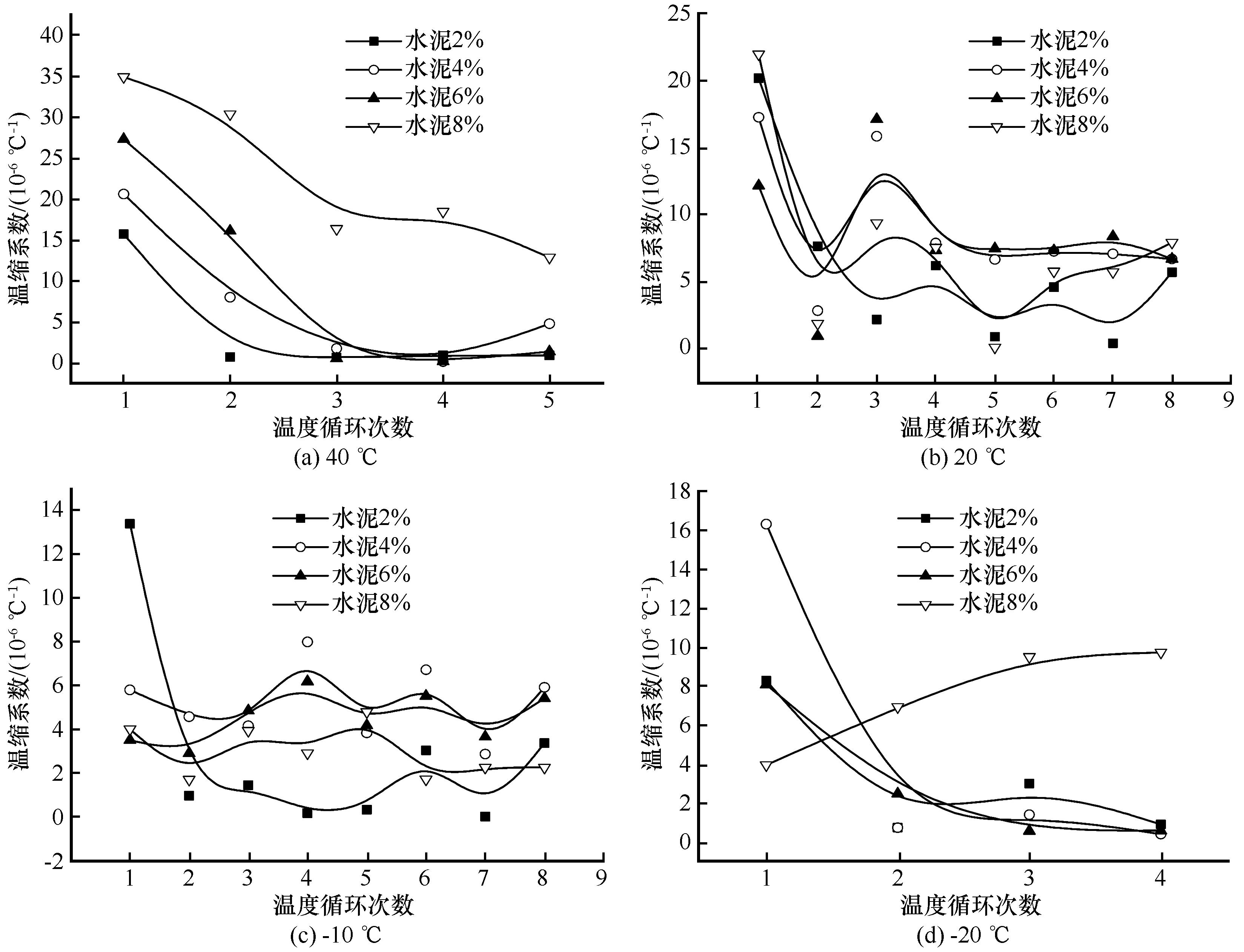 | Fig.11 Temperature shrinkage coefficient of cement modified soil changing with number of temperature cycles for various cement mixing amount at 40 ℃ (a), 20 ℃ (b), -10 ℃ (c) and -20 ℃ (d) |