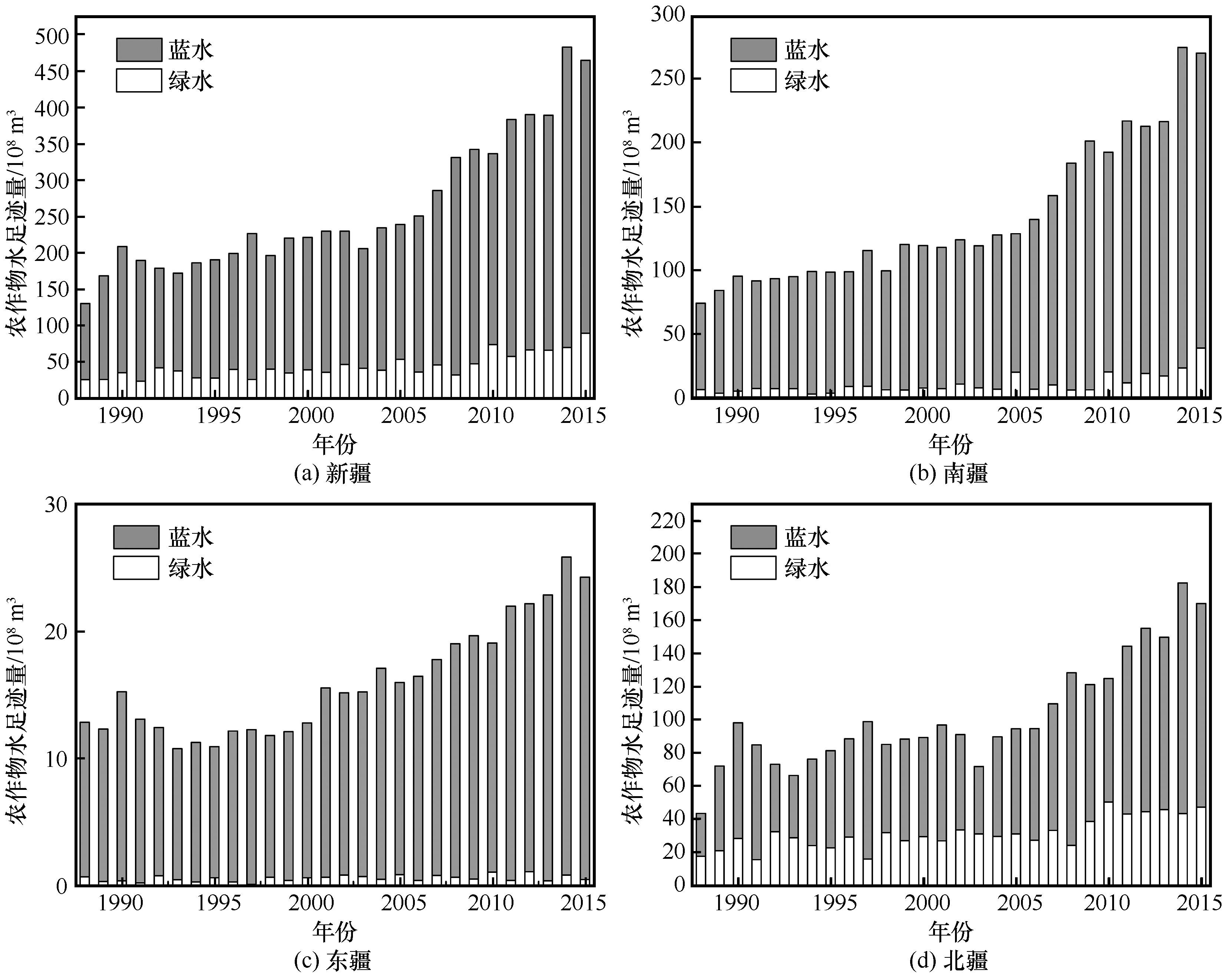 | Fig.5 Annual variations of blue water footprint and green water footprint in Xinjiang as a whole (a) and in southern Xinjiang (b), eastern Xinjiang (c) and northern Xinjiang (d) |