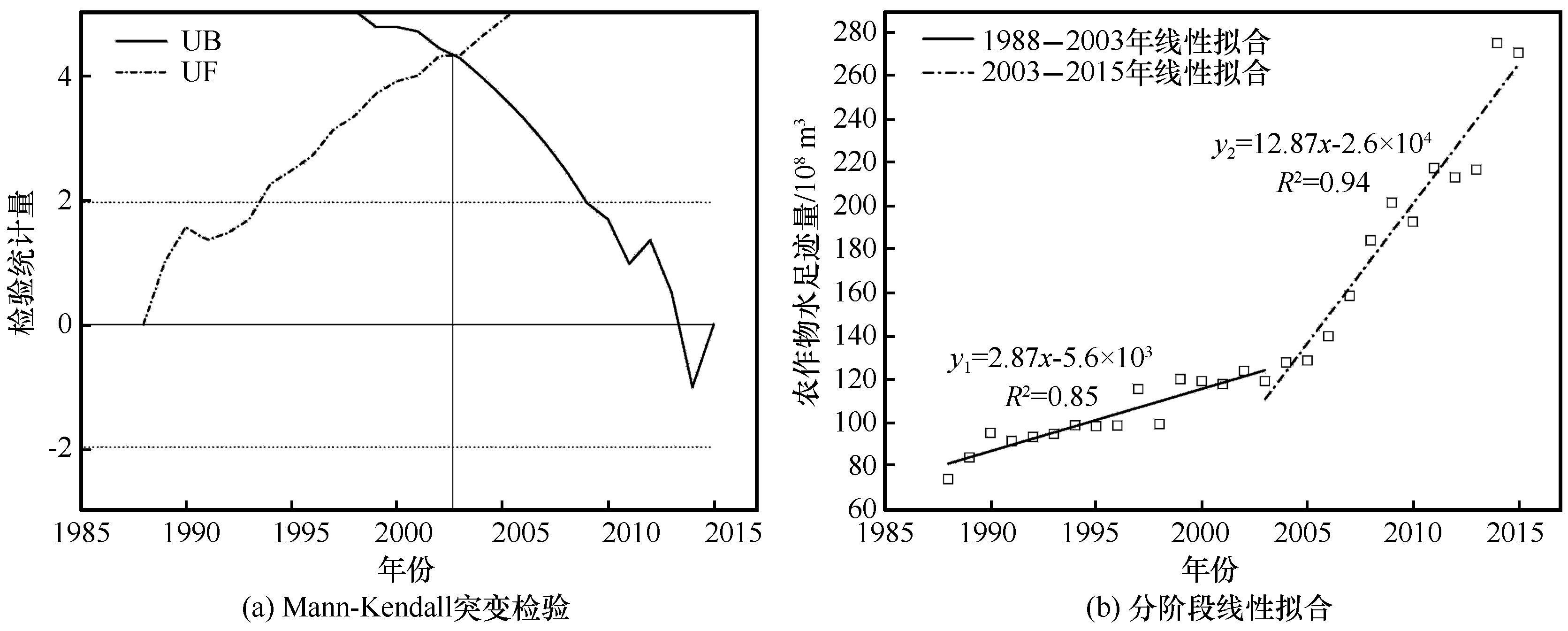 | Fig.8 The Mann-Kendall abrupt test (a) and staged linear fitting graph (b) of crop water footprint in southern Xinjiang |