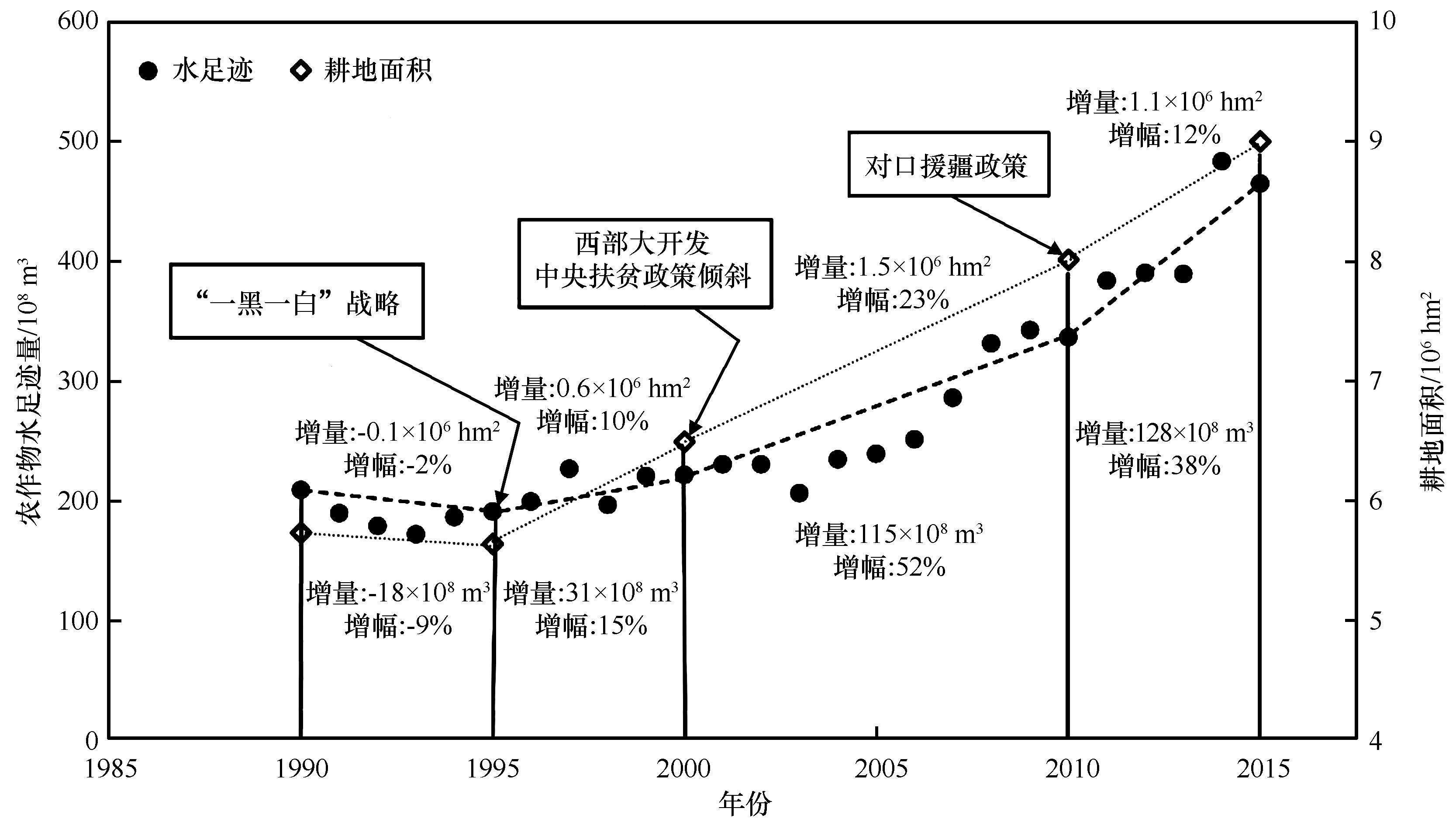 | 图10 新疆农作物水足迹增长与政策推行之间的关系(耕地面积数据来源于中国科学院资源环境科学数据中心与文献[ |