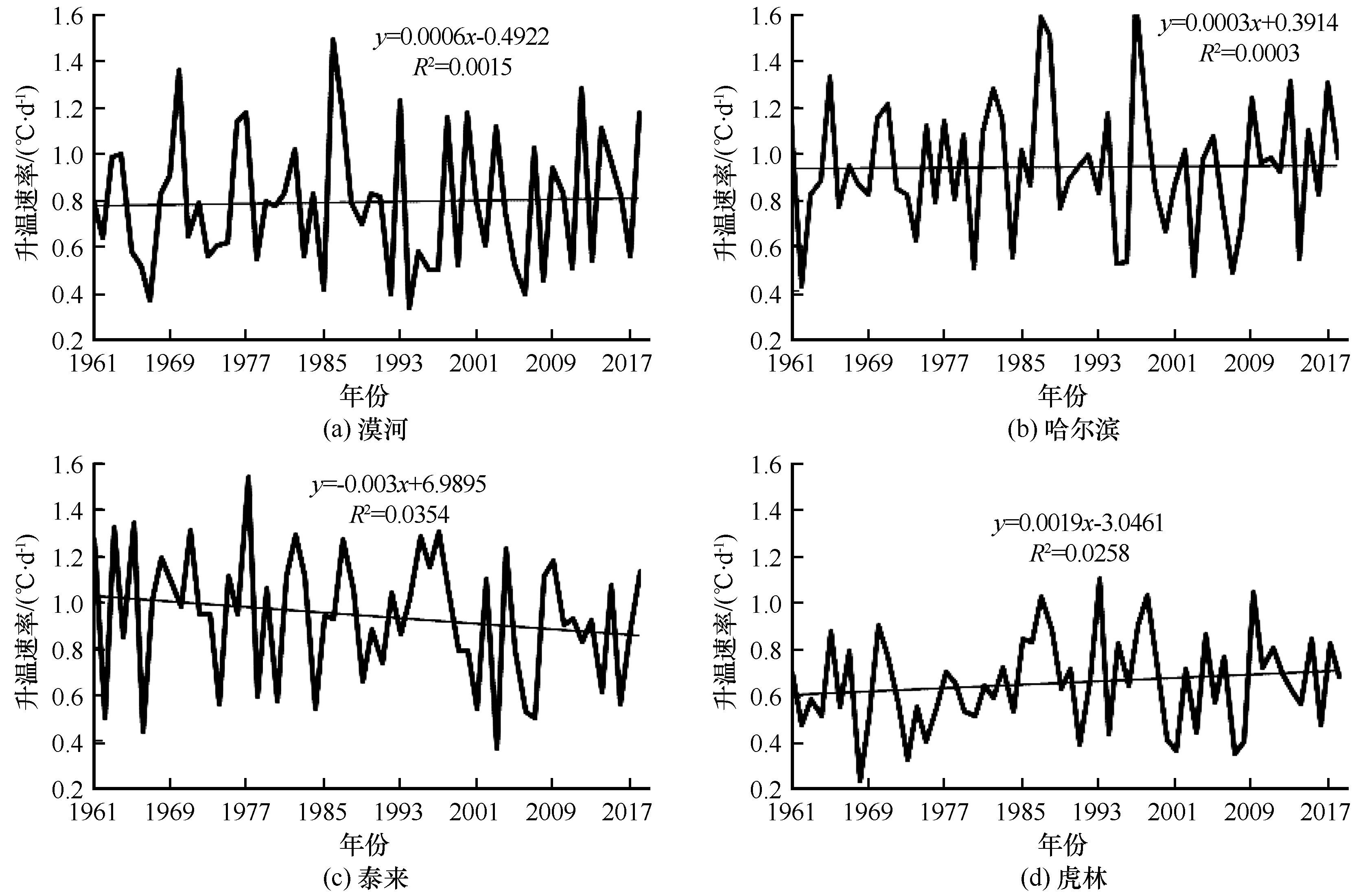 | Fig.9 Temperature rise rate of snowmelt in spring from 1961 to 2018: Mohe(a),Harbin(b),Tailai(c),Hulin(d) |