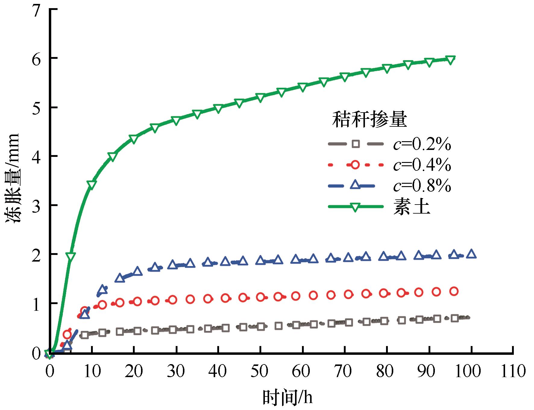 图5. 不同秸秆掺量下土样冻胀量随时间的变化(T=-3 ℃, l=15 mm) |