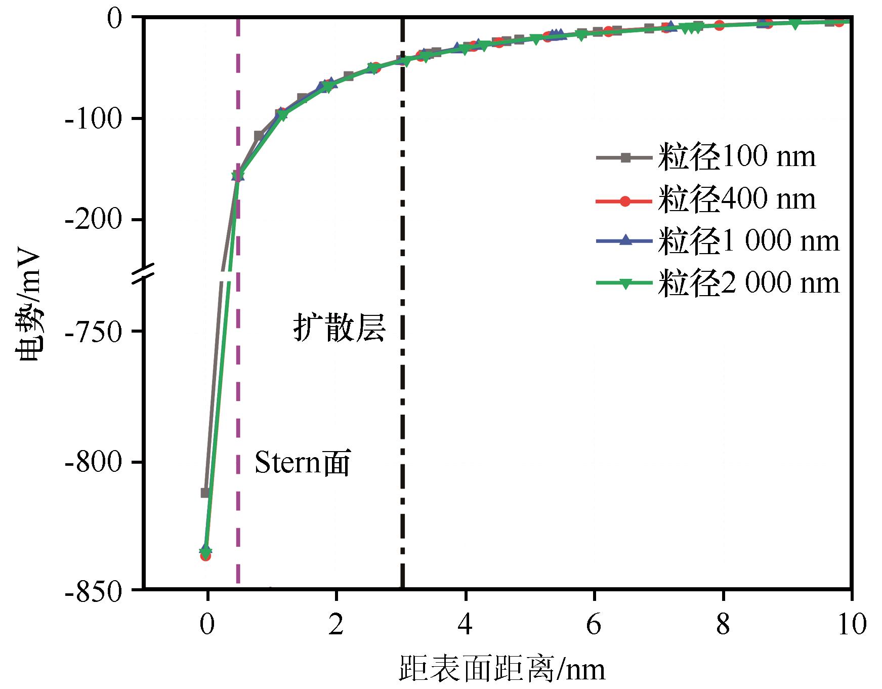 图6. 颗粒粒径对电势分布的影响(虚线表示Stern面,点划线表示扩散层与溶液的分界面) |