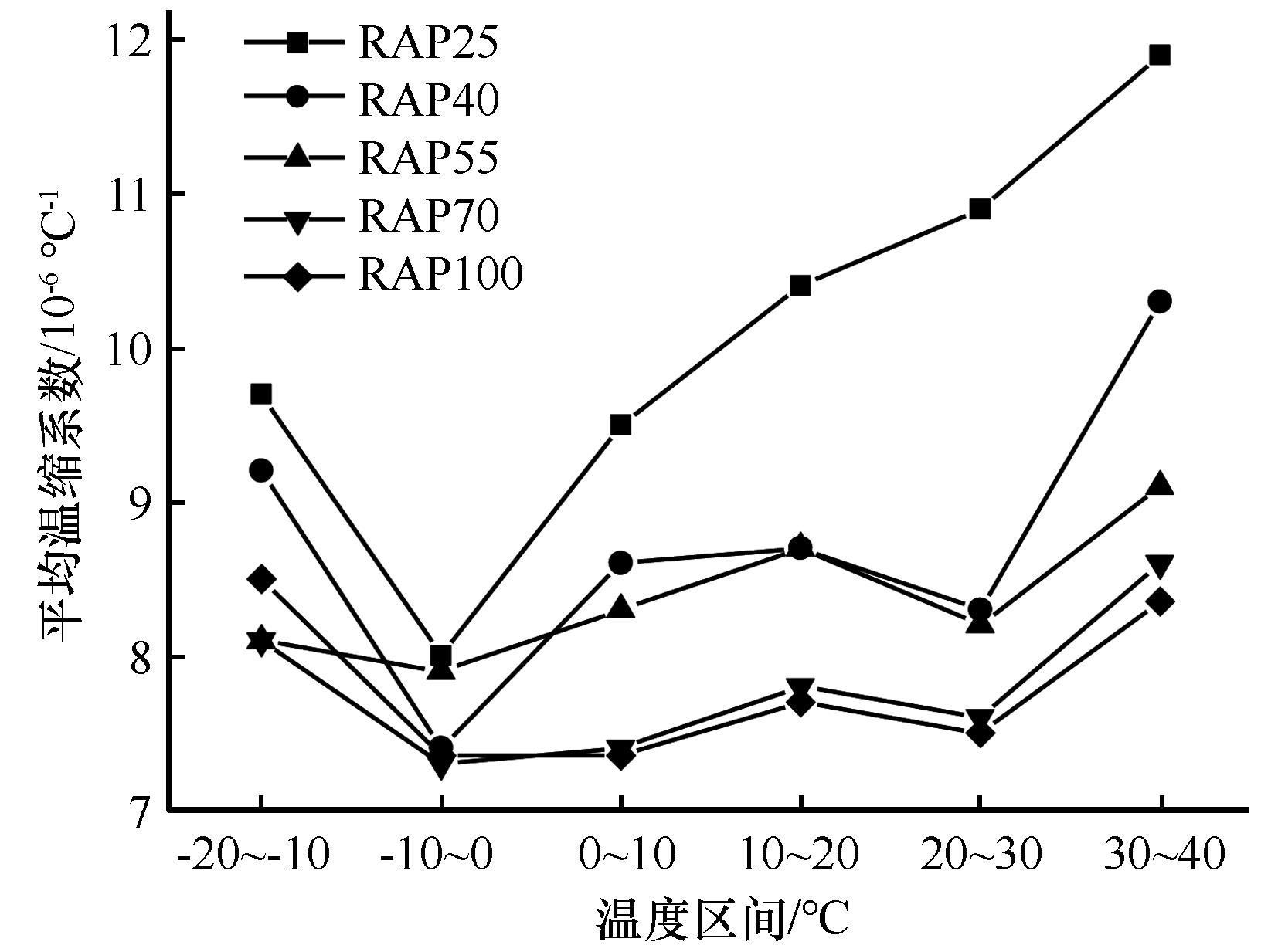 图12. 掺RAP的水泥稳定碎石(ITS=60%)温缩系数随温度区间的变化 |