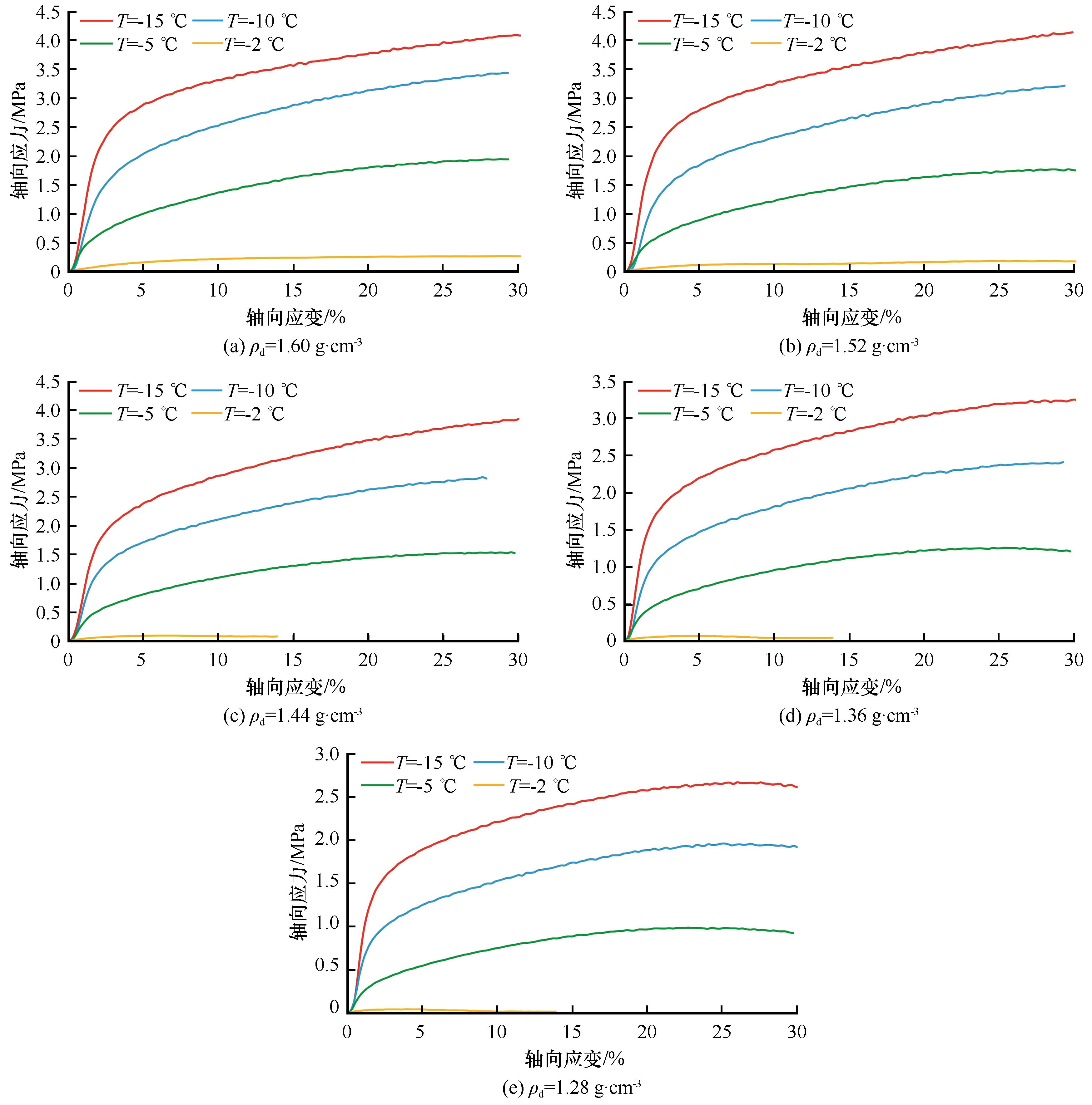 图2. 各干密度工况不同温度下的单轴压缩应力-应变关系 |