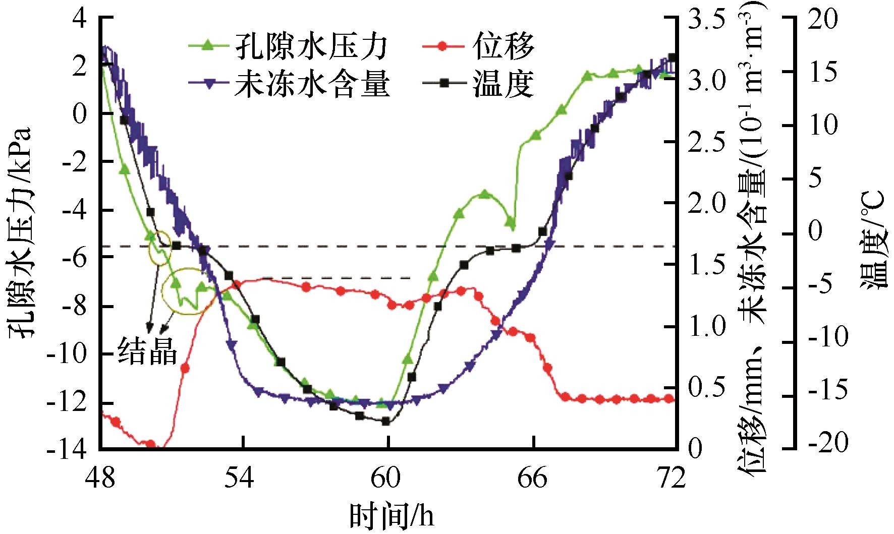 图4. S1试样(1%含盐量)在第3个冻融循环中孔隙水压力和位移的变化 |