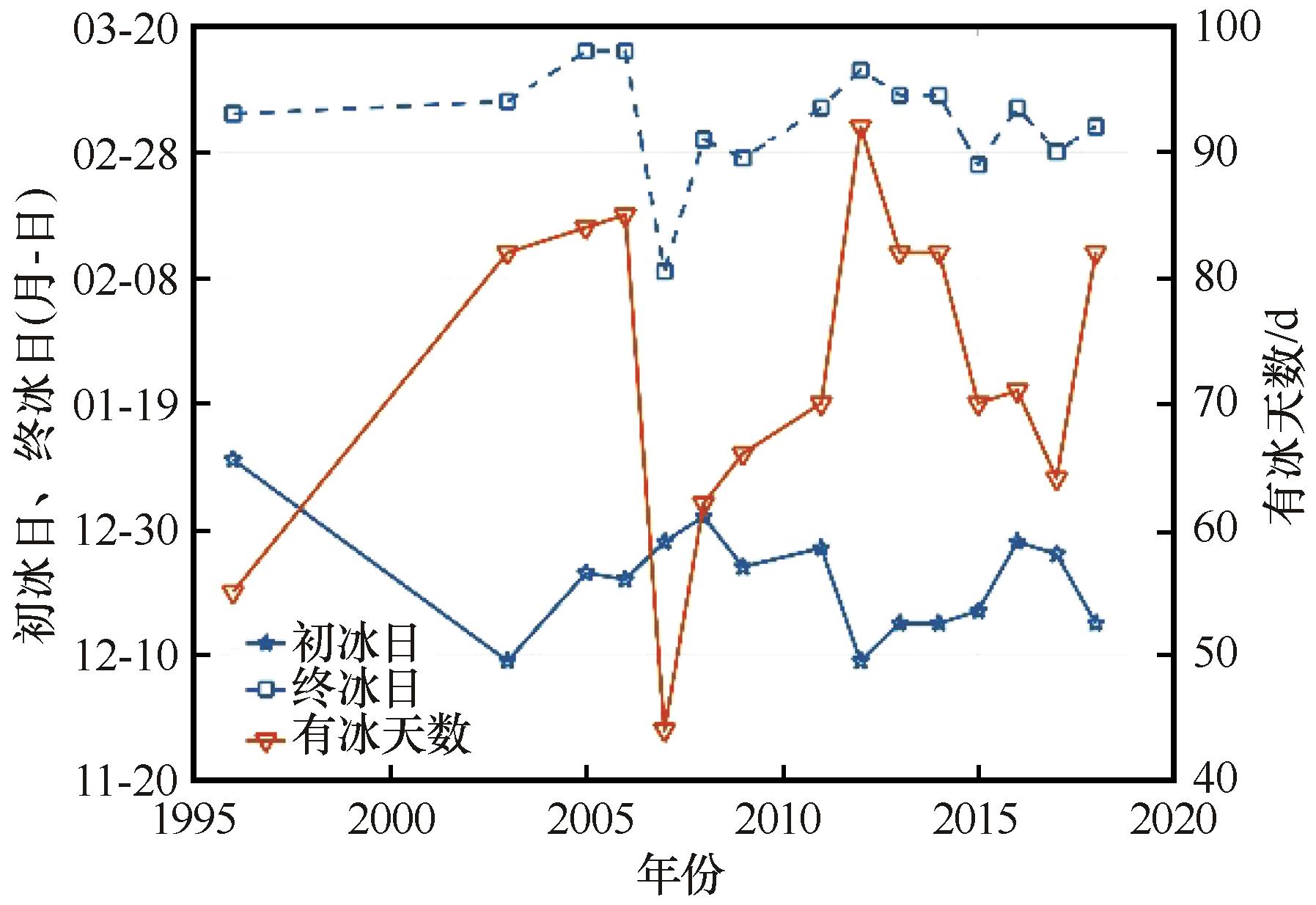 | Fig. 9 Interannual variation of first-ice date, final-ice date and ice period at Bayuquan Station |