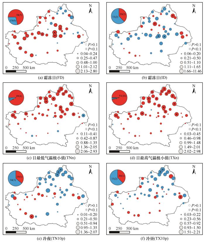 所选53个站点的冷指数空间分布趋势及时间序列显著性检验如图3所示。FD[图3(a)]、ID[图3(b)]、TN10p[图3(e)]和TX10p[图3(f)]总体表现为下降趋势,但变化程度有所不同。其中,FD、TN10p和TX10p分别有92.5%、86.8%和56.6%的站点呈显著下降趋势(P<0.05);尽管90.6%气象站点的ID呈下降趋势,但仅有18.9%通过95%显著性检验。在空间分布上,FD与TN10p的变化趋势较为一致,阿尔泰山脉南侧、伊犁河谷、吐鲁番盆地北侧和塔里木盆地南缘的变化幅度较大;FD、TN10p和TX10p下降倾向率最大分别为-7.5 d·(10a)-1、-3.4%·(10a)-1和-2.6%·(10a)-1,而下降倾向率最小仅为-0.02 d·(10a)-1、-0.04%·(10a)-1和 -0.03%·(10a)-1,说明冷指数变化幅度空间差异很大。ID变化幅度较大的地区位于南疆西北部和伊犁河谷地区,低值区位于天山山脉北侧和塔里木盆地南缘。