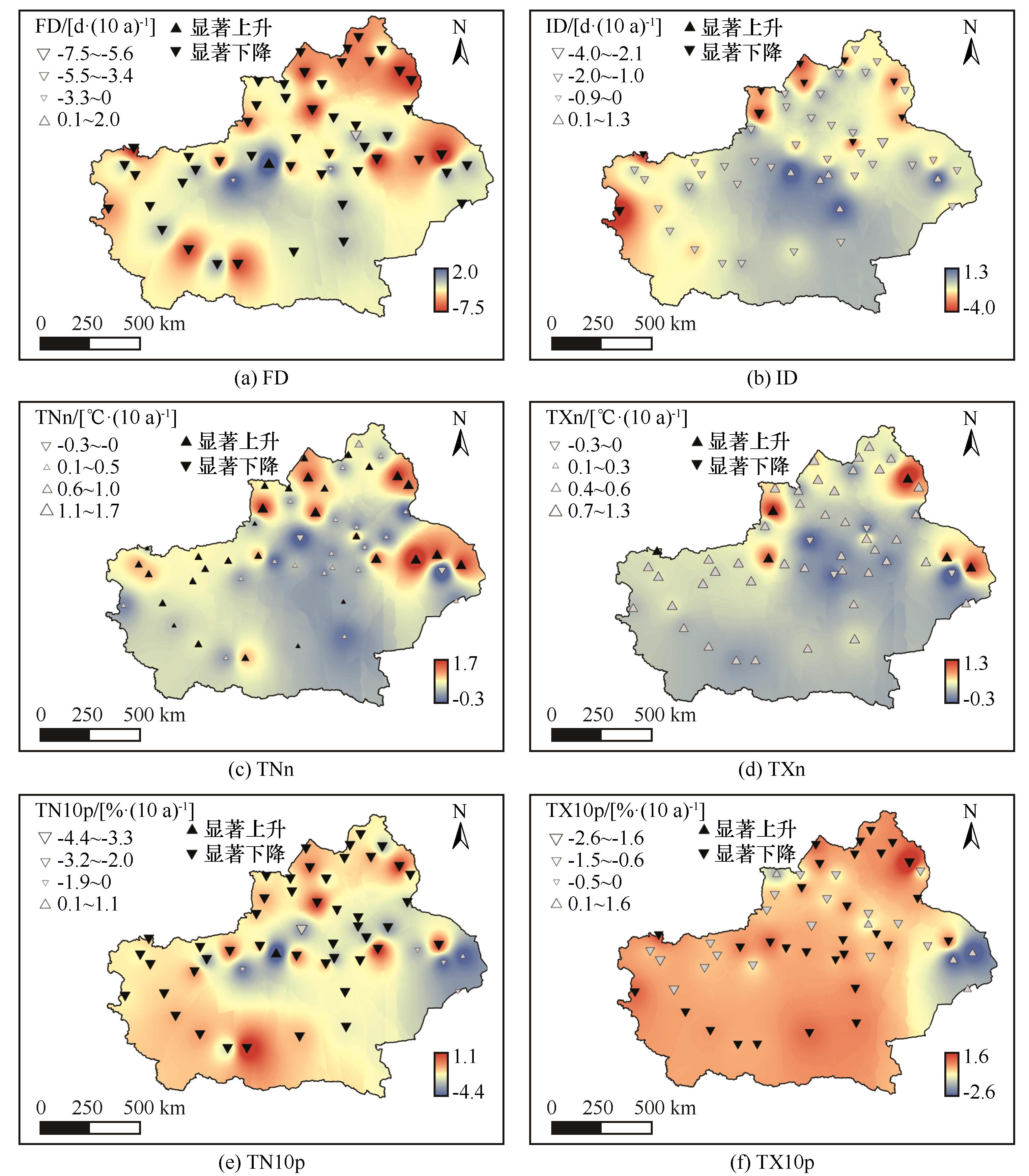 | Fig. 3 Spatial distribution trend of extreme cold indices and time-series significance test |
