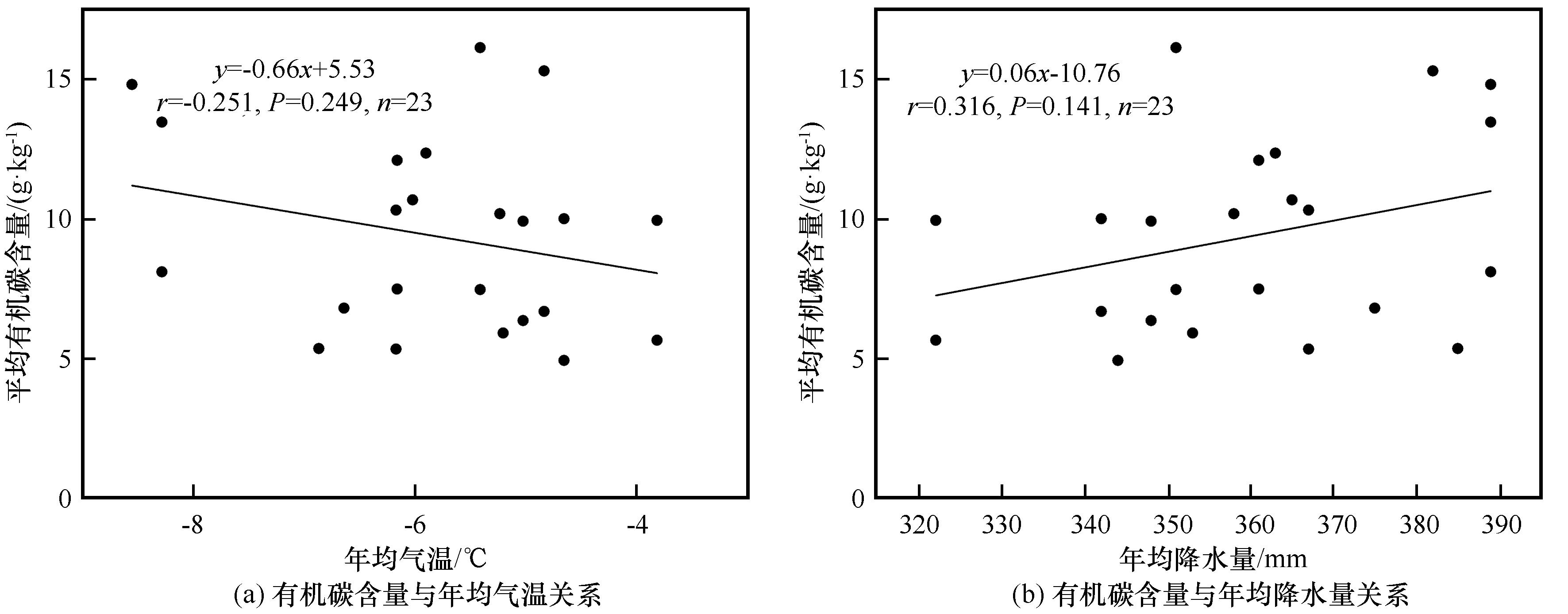 | 图4 土壤有机碳含量与年均气温、年均降水的关系 |