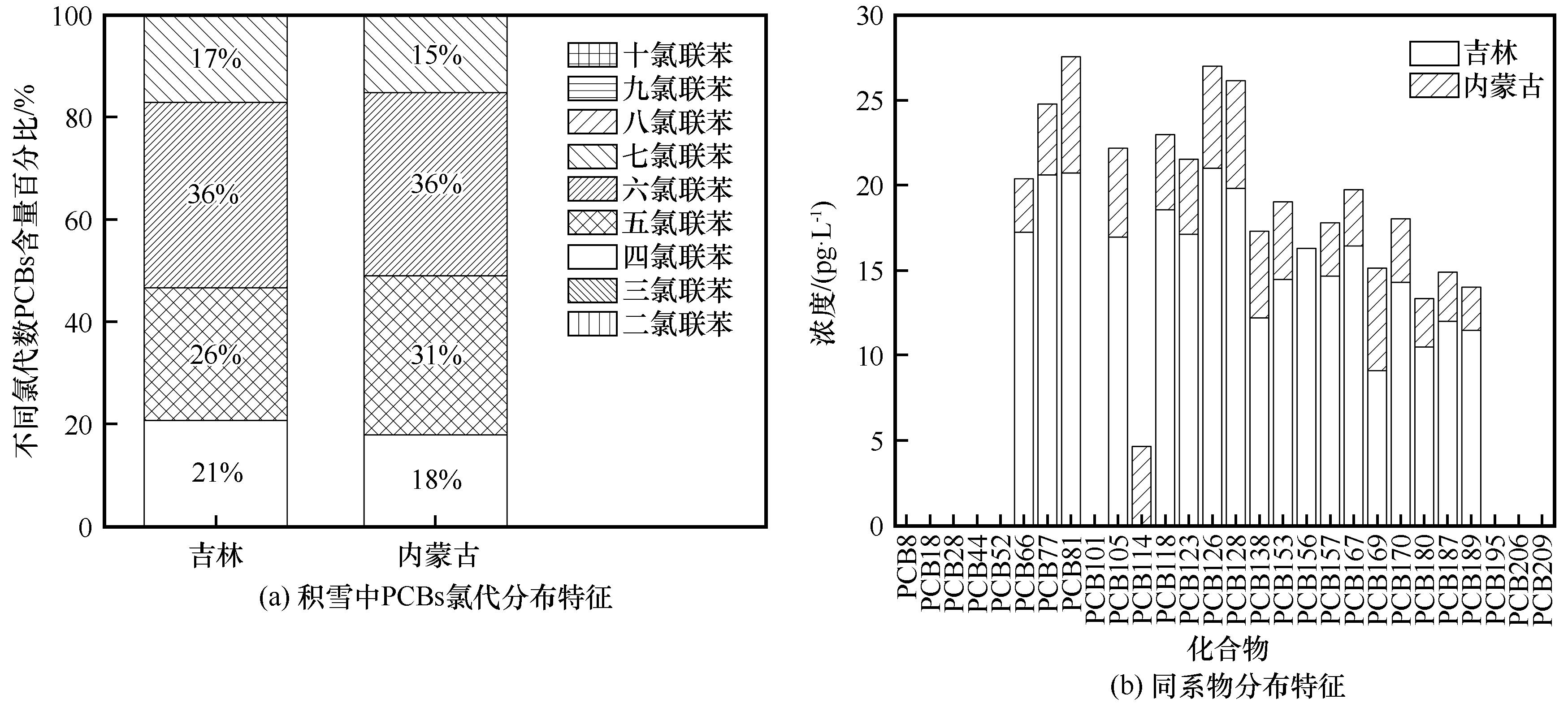 | 图6 吉林与内蒙古地区积雪中PCBs氯代分布特征(a)与同系物分布特征(b) |