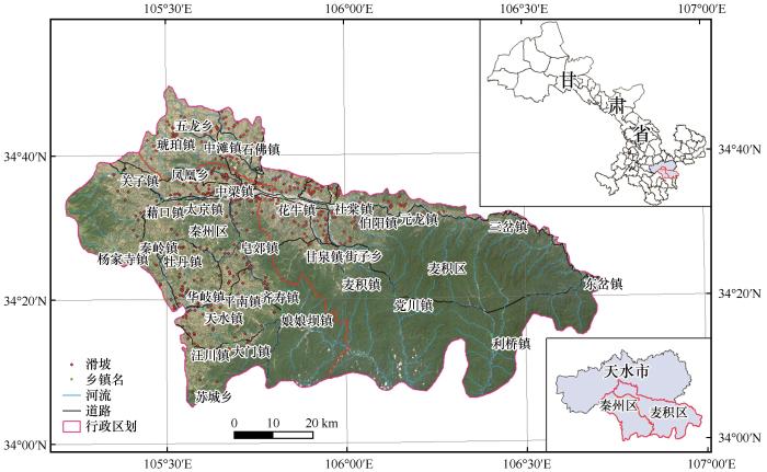 天水市位于甘肃省东南部、西秦岭北麓,地处黄土高原西部的陇中典型黄土区。研究区属黄河流域渭河水系,渭河及其一级支流藉河自西向东穿城而过,形成典型的山间河谷盆地地貌。脆弱的地质环境条件,使得天水市成为滑坡灾害的多发、高发区,严重威胁区内人民生命财产安全。天水市辖区(秦州区和麦积区)为天水市的政治、经济、文化中心,总面积约5 833 km2,其中秦州区面积约2 349 km2、麦积区面积约3 484 km2(图1),总人口约130万,人口密度约223人·km-2。地理位置为105°13′15″~106°42′58″ E,34°5′5″~34°49′40″ N。据研究区气象站多年统计资料,区内气候属暖温带半湿润半干旱气候区,年平均气温为11 ℃,最热月为7月,平均气温为22.8 ℃;最冷月为1月,平均气温为-2.0 ℃。极端最高气温38.2 ℃,极端最低气温-17.4 ℃。区内海拔高程754~2 713 m,年平均降水量491.7 mm,自东南向西北逐渐减少。降水量主要集中在夏季,占全年降水量的70%左右,且多以集中的暴雨形式出现,一般多发生在7—9月。区内一次连续最大降水量为286.6 mm,一日降水量为113 mm,小时最大降水量为57.3 mm[19]。