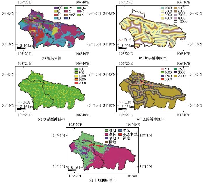 | 高程/m | 坡度 | 坡向 | 地面曲率 | 平面曲率 | 剖面曲率 | 地表粗糙度 | 地形起伏度/m | 地层岩性 | 断层缓冲区/m | 道路缓冲区/m | 水系缓冲区/m | 土地利用 | |