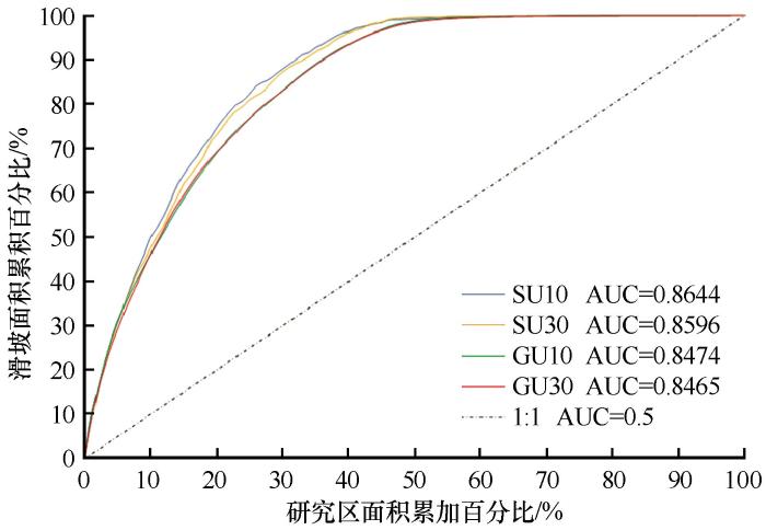 目前,受试者工作特征曲线(ROC)被普遍应用到滑坡灾害敏感性评价的精度验证中,将研究区滑坡敏感性指数(LS)按1%的面积间隔由数值从高到低均分为100份,并分别求取这100个级别内滑坡发生的面积百分比,以各敏感性等级内研究区面积累加百分比为横坐标,以各敏感性等级内研究区滑坡面积累加百分比为纵坐标,绘制ROC(receiver operating characteristic curve)曲线。利用ROC曲线与X坐标轴围成的面积AUC值(area under curve,AUC)来衡量评价结果的精度,AUC值越大,表明评价精度越高。从4个不同数据集(GU30、SU30、GU10、SU10)的滑坡敏感性评价结果获得的ROC曲线可知,曲线下面积AUC值表现为SU10(0.8644)>SU30(0.8596)>GU10(0.8474)>GU30(0.8465),表明基于斜坡单元的AUC值大于基于栅格单元的AUC值,基于斜坡单元10 m分辨率的AUC值最大,其精度和准确度最高(图8)。