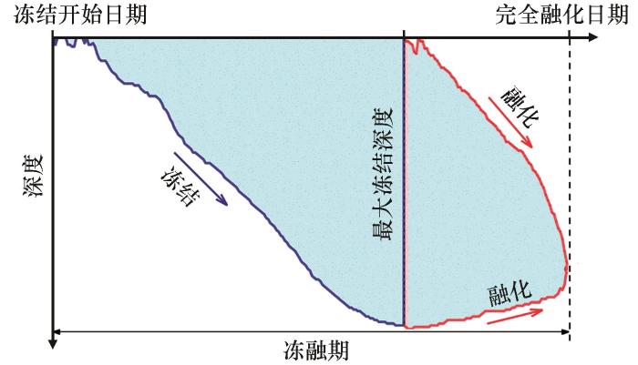 本研究利用逐日土壤冻结深度监测数据,定义了季节冻土最大冻结深度、冻结开始日期、完全融化日期和冻融期4个指标来表征三江源地区的土壤冻融状态。为了涵盖整个冻融循环过程,季节冻土的冻融周期被定义为当年的秋冬至次年的春夏,即9月1日—次年的8月31日。季节冻土最大冻结深度定义为一个完整的冻融周期中季节冻土冻结所能达到的最大深度。冻结开始日期定义为秋季开始冻结深度不为零的第一天,之后随着温度下降,土壤向下冻结,达到最大冻结深度之后温度开始上升,季节冻土开始从两个方向融化,直到季节冻土完全消失,季节冻土完全消失即次年夏季冻结深度为零的最后一天被定义为完全融化日期,冻结开始日期到完全融化日期之间这段时间定义为冻融期[32-34](图2)。此外,本研究根据三江源地区5 cm深度处的逐日土壤温度数据,以0 ℃的土壤温度作为确定土壤冻融的阈值,将每个月5 cm处土壤温度小于0 ℃的日数记为土壤月冻结天数[35],对月平均气温与地表土壤月冻结天数的关系进行了讨论。