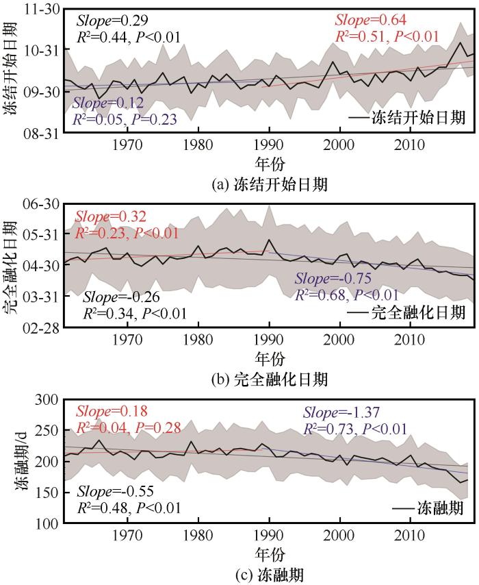1961—2019年三江源地区季节冻土冻结开始日期(a)、完全融化日期(b)及冻融期(c)时间序列(红色线条为1961—1989年该地区季节冻土冻融状态指标变化趋势拟合线,蓝色线条为1989—2019年该地区季节冻土冻融状态指标变化趋势拟合线)
