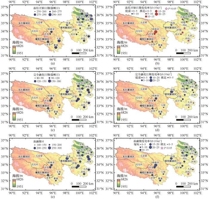 1961—2019年三江源地区季节冻土冻结开始日期(a)、冻结开始日期变化率(b)、完全融化日期(c)、完全融化日期变化率(d)、冻融期(e)、冻融期变化率(f)空间分布[图(a)、(c)、(e)中蓝点大小表示冻结开始日期、完全融化日期对应儒略日或冻融期的时长,图(b)、(d)、(f)中红点表示冻结开始日期、完全融化日期推迟或冻融期增长,蓝点表示冻结开始日期、完全融化日期提前或冻融期缩短,五角星表示未通过P<0.05的显著性检验]