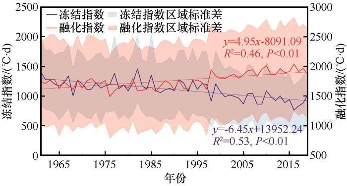 冻土作为冰冻圈的重要组成部分,起到连接冰冻圈与其他圈层的重要作用,在气候变化中有重要的指示意义[1-3]。季节冻土是指冻结日数为1个月以上,12个月以内的冻土,主要靠冷季负地温条件下的地表热交换形成,其冻融过程直接参与大气圈-地表-岩石圈之间的热量交换[4],因此季节冻土冻融状态和冻融循环的季节以及年际变化是气候变化的重要表征,也会对寒区水文[5]、地气交换、生物化学过程、工程建设和人类生产活动等产生重要影响。冻结、融化指数作为冻土研究领域的重要指标,不但能够表征冻土变化趋势,也是气候变化的指示因子[6],其变化严重影响着地-气间相互作用、水热和碳交换、水文循环以及整个生态系统,因此被广泛应用于气候变化[7-8]、土壤冻结深度[9]及其冻融循环过程变化[3,10-11]等的评估以及冻土制图[12-13]和寒区工程建设中。如今,国内外学者已经对全球季节冻土的变化开展了大量研究,结果表明,季节冻土最大冻结深度已出现不同程度的减小,其中北半球土壤冻结深度减小趋势显著,并且分布于高海拔和高纬度地区的冻结深度递减速率明显高于其他地区,由此引发的冻融灾害也日益显现,且在未来几十年内具有加剧趋势[14-17];其次,冻结开始日期和结束日期也发生明显变化,主要表现为冻结开始日期推迟,冻结结束日期提前,进而导致冻融期缩短[14]。
