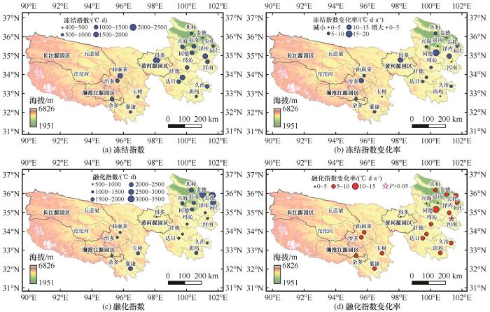由三江源地区区域平均冻结指数和融化指数随时间变化趋势(图7)可以看出,三江源地区冻结指数在1961—2019年期间表现出明显的减小趋势,融化指数则相应地在显著增大,且融化指数的增大速率[49.5 ℃·d·(10a)-1]较小于冻结指数减小速率[65.4 ℃·d·(10a)-1],可见三江源地区1961—2019年期间气温呈显著升高趋势(P<0.01),并且负温升温速率大于正温的升温速率,即该地区冷季升温较快,暖季升温较慢。从空间尺度来看,三江源地区冻结指数在385.7~2 100.4 ℃·d之间,其中有45%的站点(9个)冻结指数在1 000~1 500 ℃·d之间,贵德和尖扎站冻结指数在400~500 ℃·d之间,尖扎站最小,仅为385.7 ℃·d,其余有5个站点冻结指数在500~1 000 ℃·d之间,3个站点在1 500~2 000 ℃·d之间,超过2 000 ℃·d的仅有玛多站(2 100.4 ℃·d)一个站点[图8(a)];融化指数在842.7~3 422.2 ℃·d之间,其中有45%的站点(9个)融化指数在1 000~1 500 ℃·d之间,融化指数小于1 000的站点只有玛多站一个站点,仅为842.7 ℃·d,其余有5个站点融化指数在1 500~2 000 ℃·d之间,2个站点在2 000~2 500 ℃·d之间,1个在2 500~3 000 ℃·d之间,贵德和尖扎站融化指数超过了3 000 ℃·d,尖扎站融化指数最大,达到了3 422.2 ℃·d[图8(c)]。
