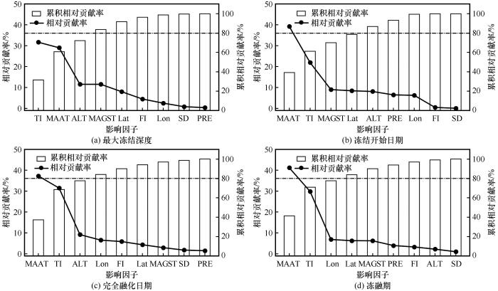 1961—2019年三江源地区季节冻土最大冻结深度(a)、冻结开始日期(b)、完全融化日期(c)、冻融期(d)影响因子贡献率(ALT为海拔,Lat为纬度,Lon为经度,SD为雪深,PRE为降水,MAAT为年平均气温,MAGST为年平均地表温度,TI为融化指数,FI为冻结指数;虚线表示累积贡献率达到80%)