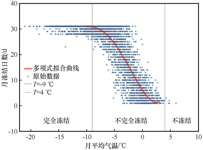 根据三江源地区5 cm深度处逐日土壤温度数据确定的月冻结天数以及月平均气温的相应关系发现,月平均气温与月冻结天数有较强的关系,当月平均气温小于-9 ℃时,土壤月冻结天数大部分为30天或31天(2月为28或29天);-9~4 ℃时土壤月冻结天数随着月平均气温的升高而减少;当月平均气温大于4 ℃时,土壤月冻结天数基本为0天(图11)。根据以上月冻结天数和月平均气温的关系,将地表土壤冻结状态按照月平均气温的阈值划分为以下三种情况:完全冻结(T<-9 ℃)、不完全冻结(-9 ℃≤T≤4 ℃)和不冻结(T>4 ℃)。完全冻结状态指的是地表土壤整月都完全冻结;不完全冻结状态指的是地表土壤在该月部分时间发生冻结,部分时间未发生冻结;不冻结状态指的是地表土壤在该月未发生冻结[35]。