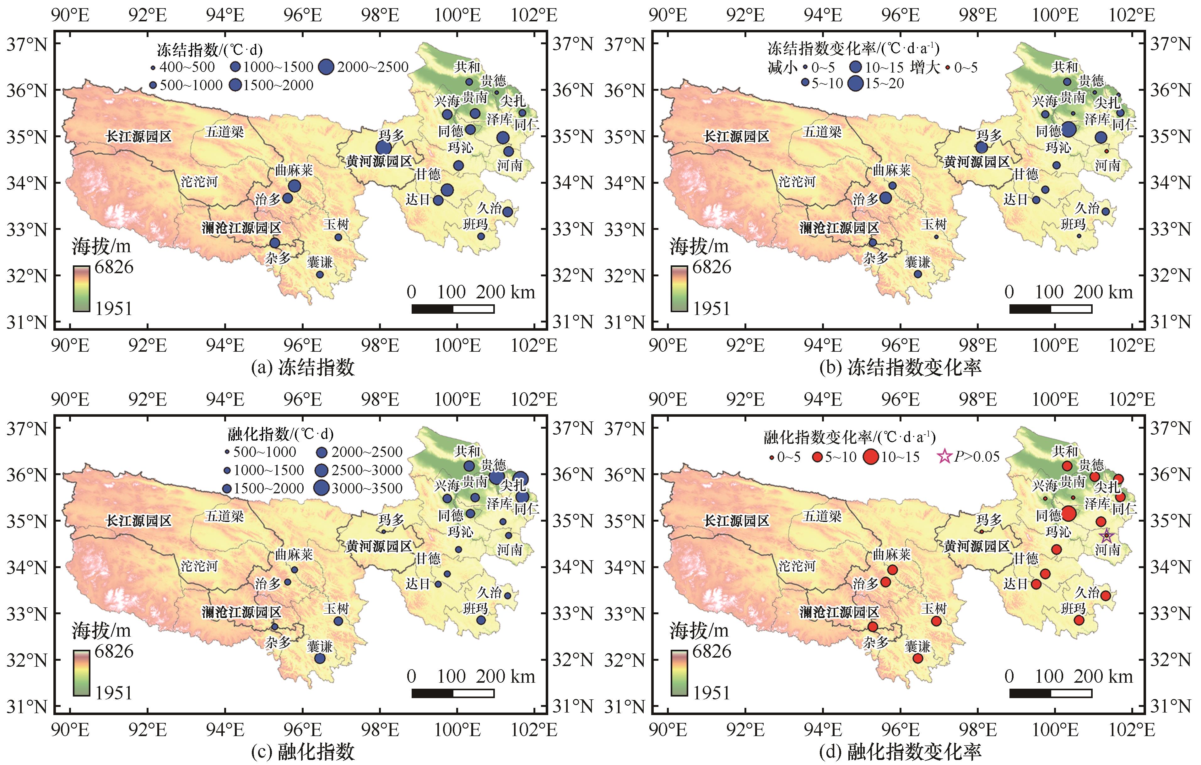图8. 1961—2019年三江源地区冻结指数(a)、冻结指数变化率(b)、融化指数(c)、融化指数变化率(d)空间分布[图(a)、(c)中蓝点大小表示冻结、融化指数大小,图(b)、(d)中红点表示冻结、融化指数增大,蓝点表示减小,五角星表示未通过P<0.05的显著性检验] |