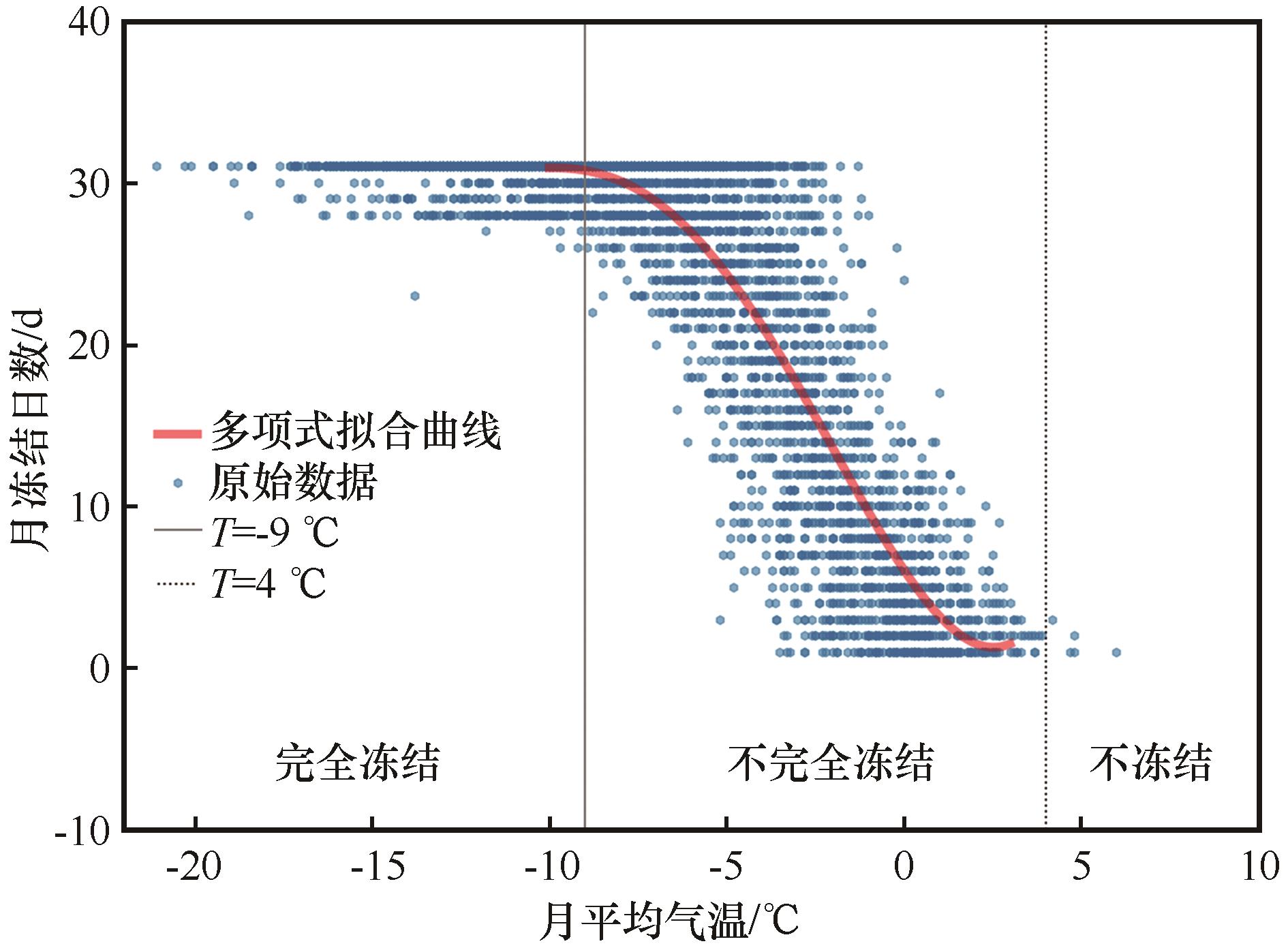 Fig. 11. Relationship between the mean monthly air temperature and the monthly soil frozendays at 5 cm depth in the Three Rivers Source Region from 1961 to 2019 |